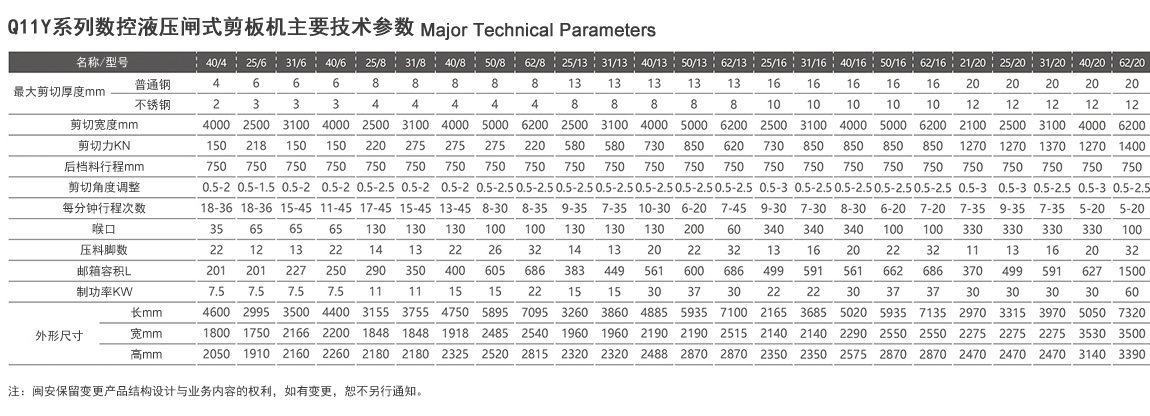 机架采用整体焊接结构,经振动去除应力,采用三点式支承滚动导航,提高剪切质量,矩形刀片,四刃均可使用,使用寿命长,刀片间隙可迅速调整,并有数值显示。